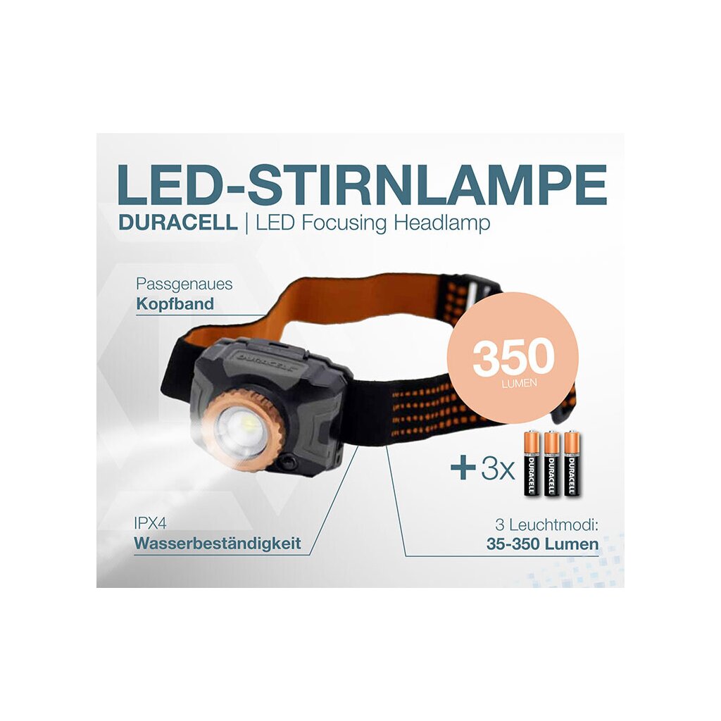 Die Duracell LED-Stirnlampe bietet mit 350 Lumen eine leistungsstarke Beleuchtung für vielfältige Anwendungen. Ob bei nächtlichen Wanderungen, Campingausflügen oder handwerklichen Tätigkeiten – diese Stirnlampe sorgt für klare Sicht und freie Hände.