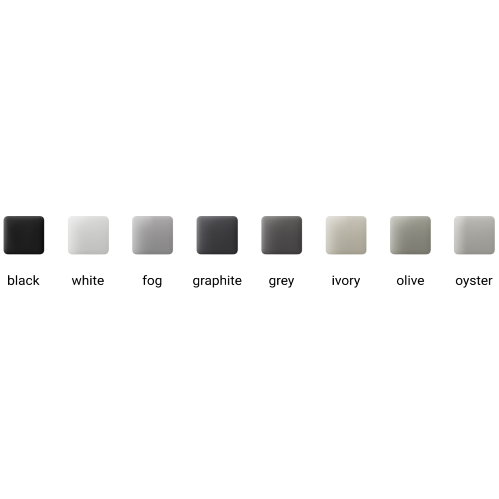 - Sie können zwischen acht Farben wählen: Weiß, Schwarz, Elfenbein (Ivory), Grau, Graphit (Anthrazit), Nebel (Fog), Auster (Oyster) und Olive.