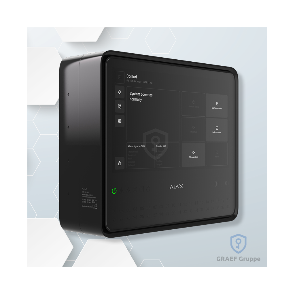 Der Ajax EN54 Fire Hub Jeweller ist die zentrale Steuereinheit für moderne, kabellose Brandwarnsysteme nach EN 54. Entwickelt für professionelle Anwendungen im gewerblichen, öffentlichen und kommunalen Bereich, bietet der Fire Hub höchste Sicherheit, vollständige Normkonformität und eine benutzerfreundliche Steuerung über Touchscreen, App oder Fernzugriff.