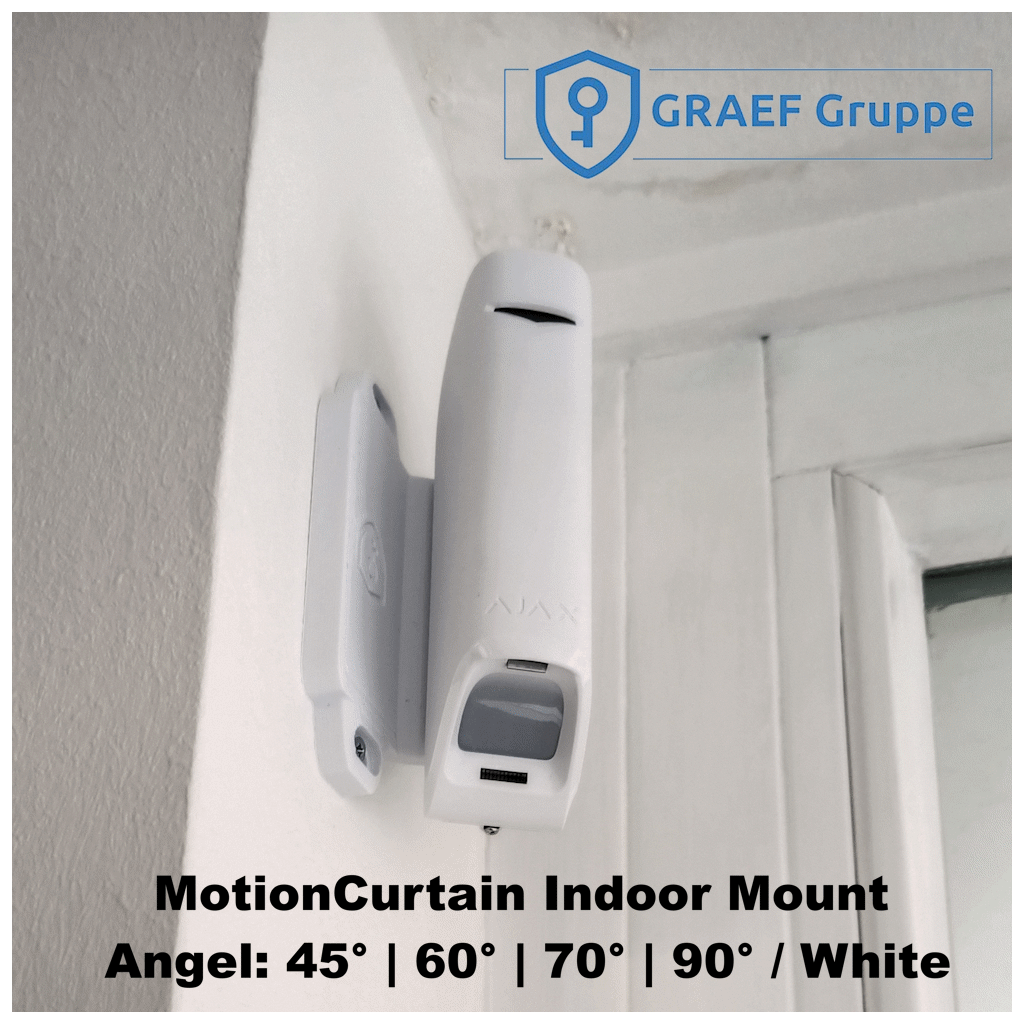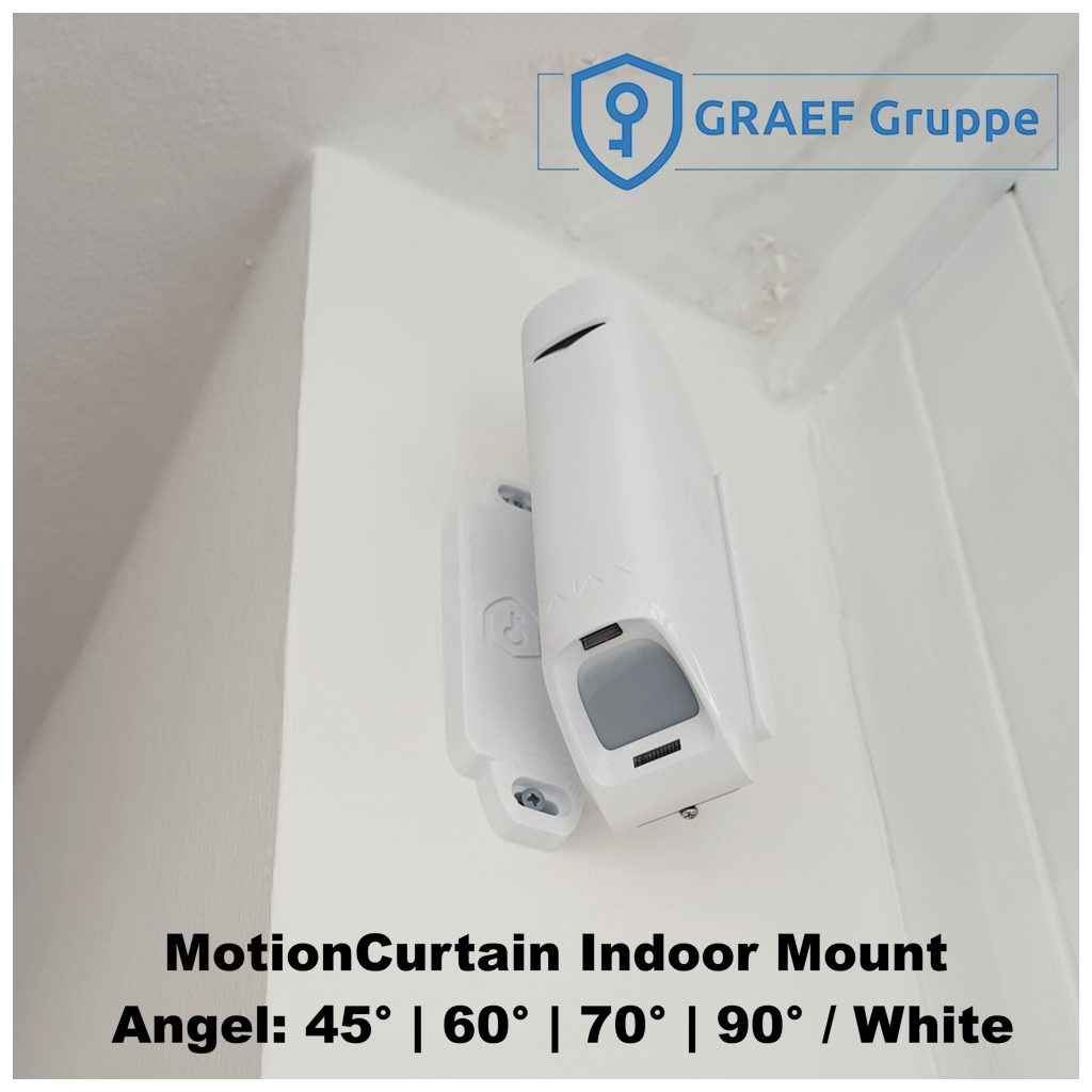 Die MotionCurtain Indoor Mount Halterungen in Weiß sind in vier verschiedenen Winkeln – 45°, 60°, 70° und 90° – erhältlich und ermöglichen eine passgenaue Wand- oder Eckmontage des Ajax MotionCurtain Indoor Bewegungsmelders. Mit diesen Halterungen lässt sich der Sensor optimal an die jeweilige Raumsituation anpassen – ob für schräge Flächen, Ecken, Fensterbereiche oder Durchgänge. Das dezente weiße Design fügt sich harmonisch in helle Wohn- und Arbeitsumgebungen ein.