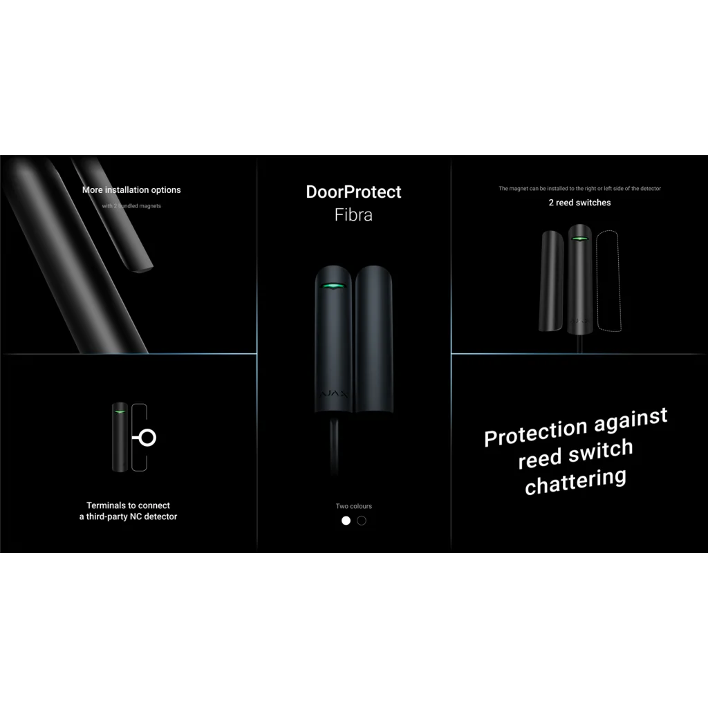 Ajax DoorProtect Fibra er en buskablet åbningsdetektor. Designet til indendørs brug. Understøtter tilslutning af en tredjeparts NC-detektor, og rækkevidden for den kablede forbindelse er op til 2000 meter, når den tilsluttes via parsnoet U/UTP Cat.5.
