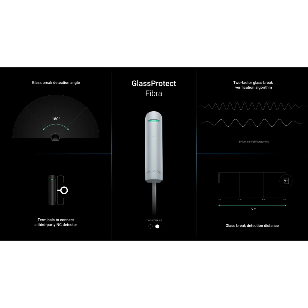 Ajax GlassProtect Fibra er en bus-glasbruddetektor. Designet til indendørs brug. Understøtter tilslutning af en normalt lukket tredjepartsdetektor. Rækkevidden for den kablede forbindelse er op til 2000 meter, når den er forbundet via parsnoet U/UTP Cat.5.
