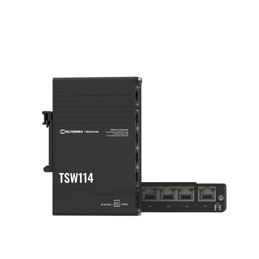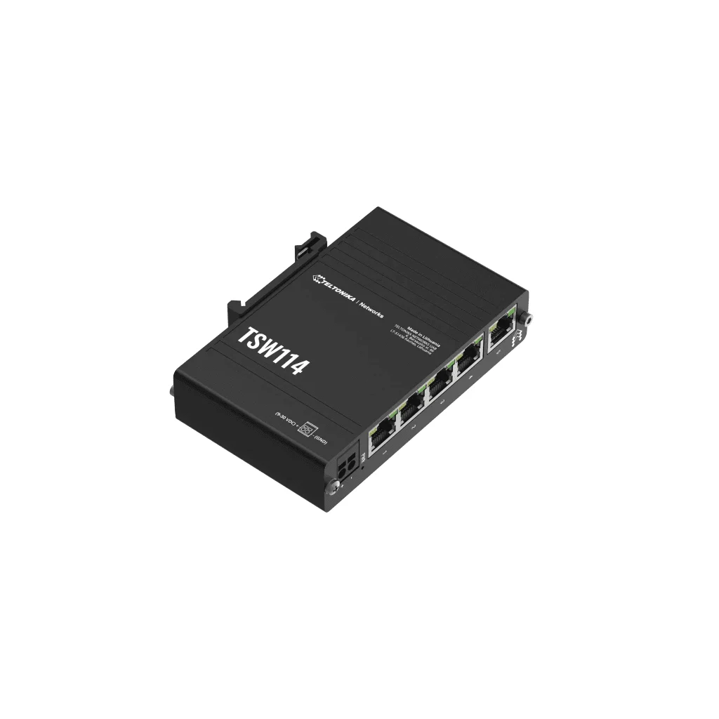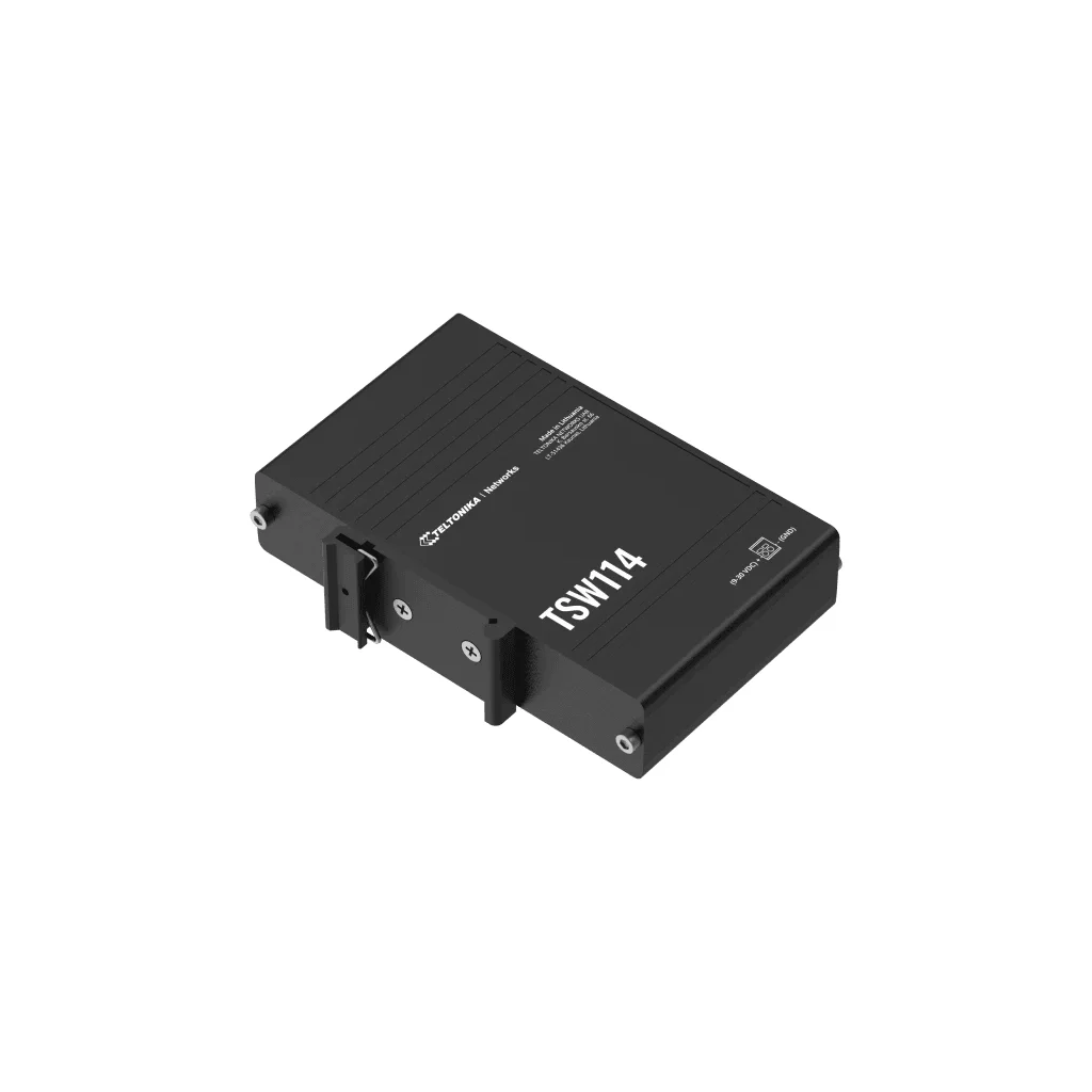 TSW114 fra Teltonika Networks er en overkommelig måde at forenkle dine tilslutningsmuligheder på. Med sine 5 x Gigabit Ethernet-porte giver den stabile og pålidelige forbindelser til løsninger med høj båndbredde. Switchen har frontvendte porte og en integreret DIN-skinnemontering, der gør det nemt at installere i mange industrielle miljøer, især i kontrolskabe.