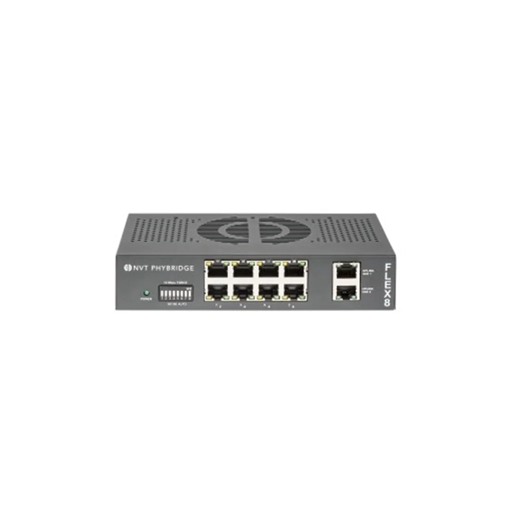 NVT Phybridge FLEX8 langtrækkende plug-and-play PoE-switch er en alsidig, højtydende løsning, der også er velegnet til virksomheder. Den har otte downlink-porte, der leverer hurtig Ethernet (10/100 Mbps fuld duplex, balanceret) og PoE++ (50 W pr. port) over multiparrede UTP-kabler i op til seks gange så lang afstand som traditionelle PoE-switche. FLEX8-switchen har to 1 Gbit uplink-porte til daisy chain-implementeringer. Standardfunktioner omfatter en 190 W ekstern strømforsyning og et monteringssæt til væg- eller rackmontering.
