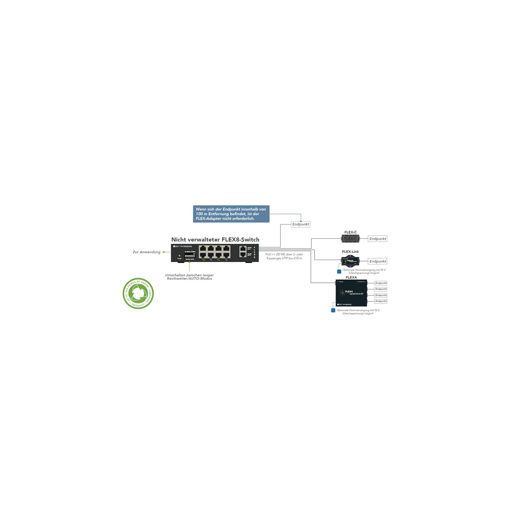 FLEX8-switchen bruger nye eller eksisterende 1-, 2- eller 4-pars UTP-kabler. Den kan betjenes i standard PoE-tilstand (uden adapter) op til 100 m eller i Long Reach Ethernet-tilstand (med adapter) op til 610 m inklusive PoE. FLEX8-switchen genkender automatisk datatransmissionshastigheden og kan derfor konfigureres til maksimal båndbredde og transmissionsafstand. en switch kan bruges til at fremtvinge en båndbredde på 10Mb, hvis det er nødvendigt for at etablere en forbindelse.