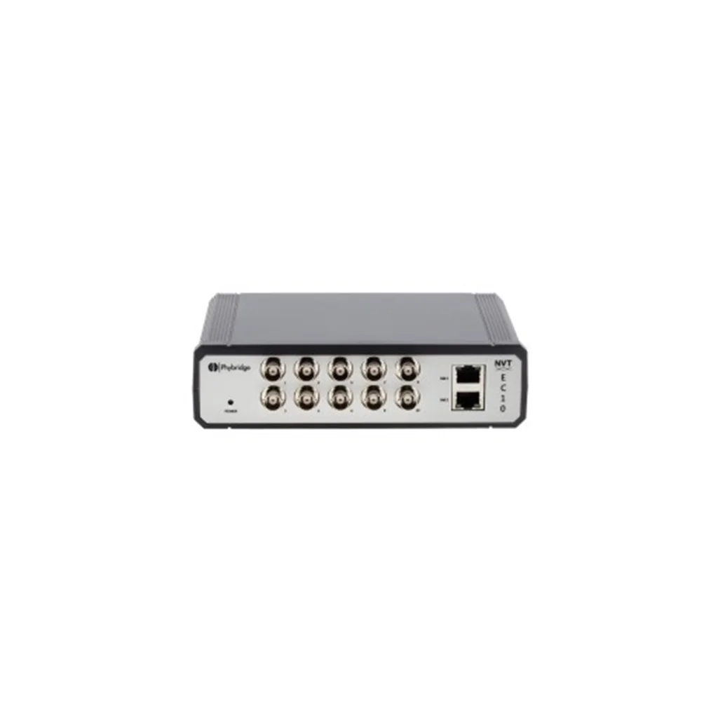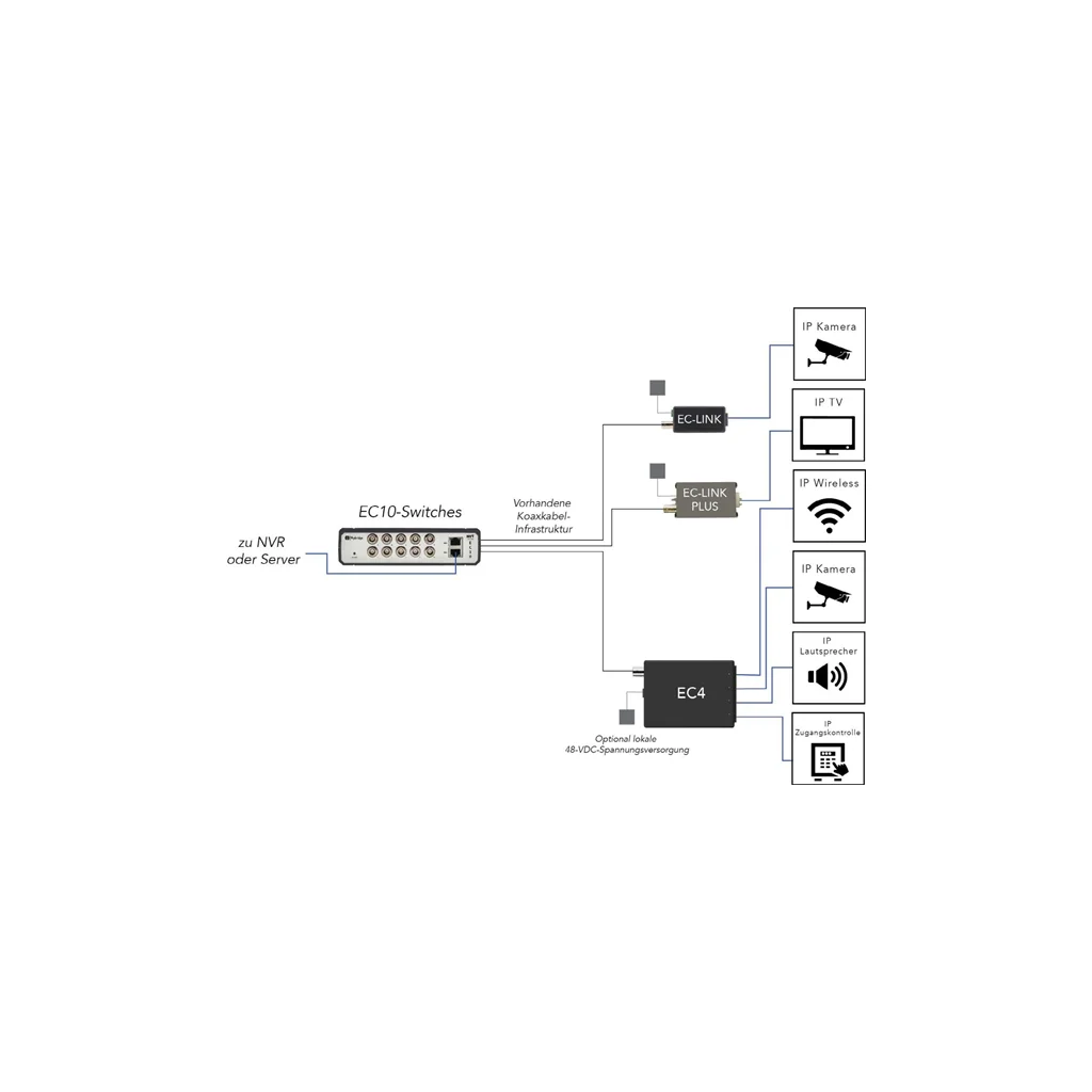 Plug-and-play-switchen EC10 (Ethernet over Coax) er en ikke-administreret switch med 10 porte til realisering af Ethernet over koaksialkabel. Den højtydende switch tilbyder Fast Ethernet og PoE+ via koaksialkabel med en rækkevidde på op til 610 meter.